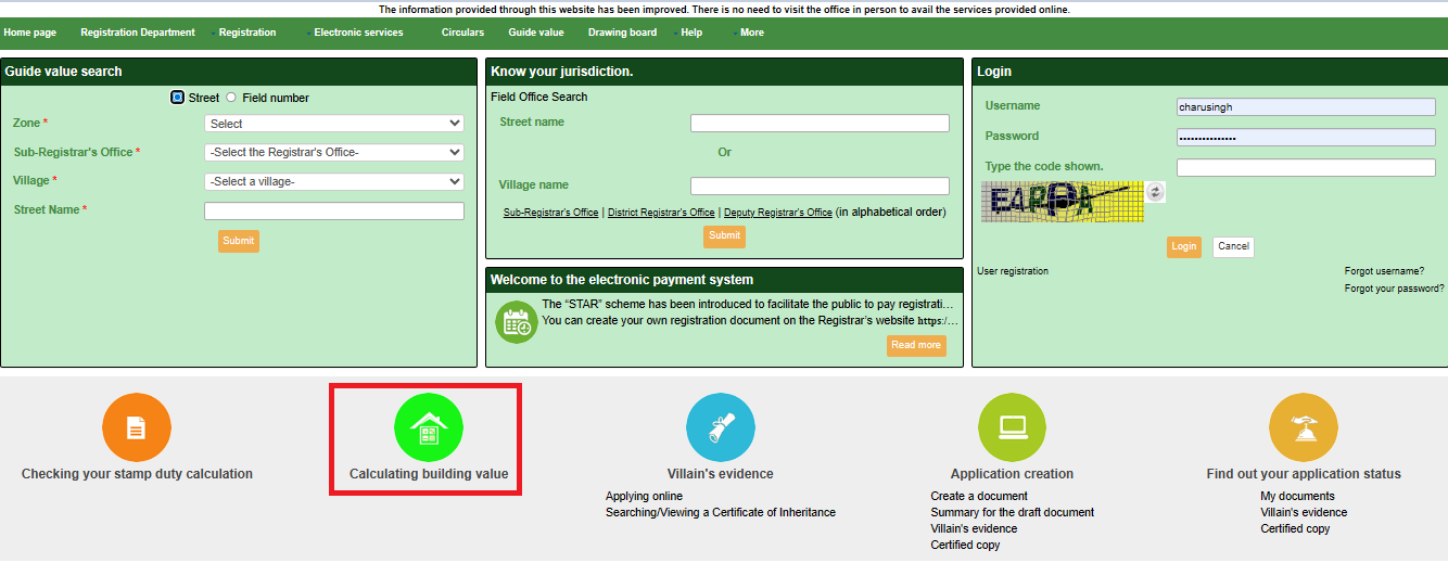 - Portal Access: Visit https://tnreginet.gov.in/portal/ in your browser. Scroll to the footer and click on "CALCULATE BUILDING VALUE", that appears with a green house logo