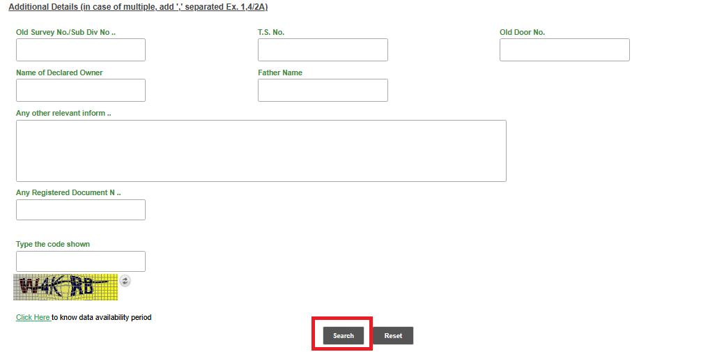 • Additional: Old survey number, declared owner, any known document numbers. Solve the CAPTCHA and click "Search" to preview related records.